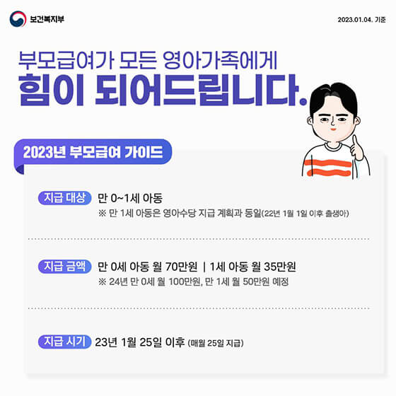 · 지급금액 : 0세 아동(1세 아동 월 70만 원 / 1세 아동 월 35만 원)
