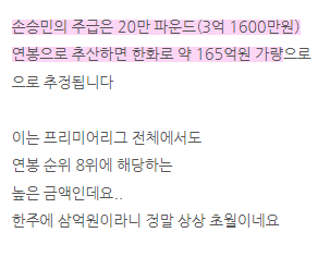 손흥민 주급은 20만 파운드 (3억 1600만 원)이다