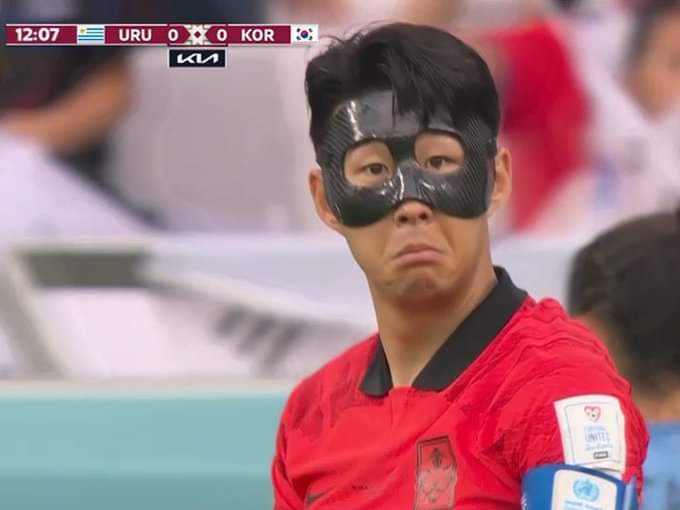 한국 축구대표팀 주장 손흥민이 불완전한 얼굴로 투혼을 발휘하고 있다.