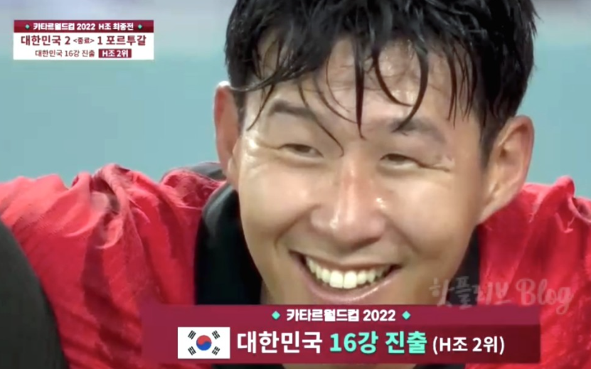 손흥민은 "보고 패스를 했다. TV로 보시는 분들은 안 보고 패스하는 줄 알지만 "희찬이가 어느 순간 지나가면 좋은 장면에서 슛을 날릴 것"이라는 계산과 플레이를 한다"며 "사실 70~80m를 달려서 그렇게 하는 것은 쉽지 않다"라고 말했다. 공간이 열리자 슈팅을 시도했지만 서너 명이 위험한 지역에 포위됐다. 희찬이가 들어오는 것을 봤다. 줄 공간이 마땅치 않았는데 그 순간 아! 다리 사이였다. 마무리를 잘해줬다."라고 그가 자랑스럽게 말했다.가나전은 슬픔과 분노의 눈물이었고 포르투갈전은 기쁨과 기쁨의 눈물이었다.