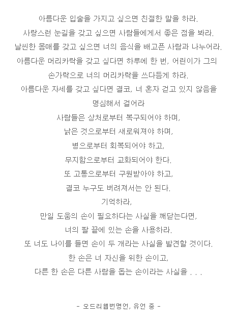 사랑스러운 그녀 오드리 햅번에 대한 글 입니다. 오드리 햅번 그녀는 어떤 삶을 살았던 것일까요? 그녀의 화려하기만 했던 모습과 반대로 아프리카에서 봉사하는 모습까지 정말 너무 아름다운 여인입니다.
