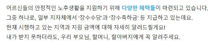 노인 지원 정책 장수수당 장수 축하금을 소개합니다. 많은 분들에게 알려주세요.