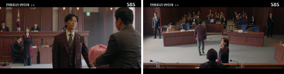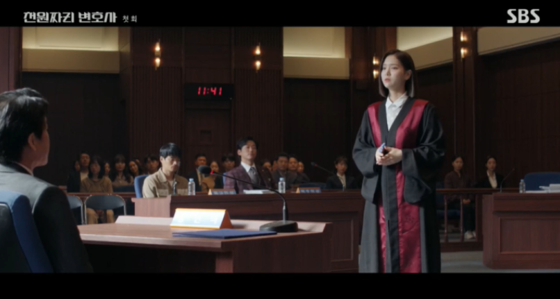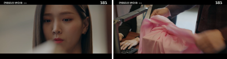 그리고 증거물을 확인하고 "이게 증거물이라고요?"라고 말하는 백 마리 검사는 과연??? 증거물이 뭘까요??? 시정자들의 호기심과 궁금증을 이끌어내는 데 성공한 듯합니다. 핑크 빛 보자기에 싸놓은 증거는 무엇일까요? 천변은 "증거 채택 거부할 이유 없죠?"라고 말을 하면서, 이렇게 천 원짜리 변호사 첫 회가 마무리되었습니다.