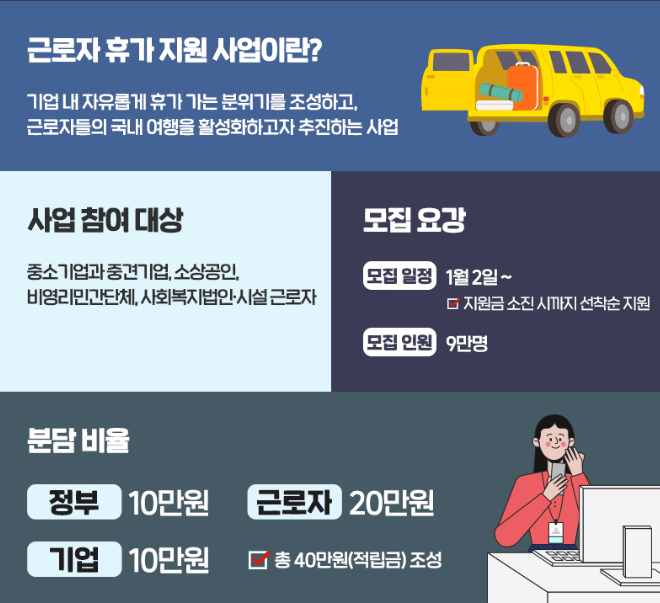 휴가는 직장인들이 듣는 것만으로도 기분이 좋아지는 말이다. 여기서 휴가와 관련하여 기분이 좋아지게 하는 정책이 있습니다. 놓치면 안 쉬운 휴가비 챙겨가세요. 2023년 근로자 휴가 지원 사업 참여자를 모집합니다.